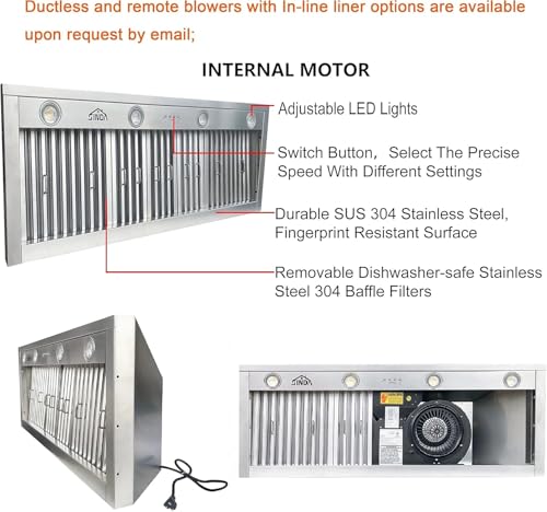?Ventilation?: Comes with build-in/insert range hood with 4 speed fan, adjustable LED lights, baffle filter(reusable, dish-washer safe). 30"/36"W - max airflow(noise level):610 CFM(6.5Sone), 6" round duct; 42"/48"W -max airflow(noise level): 1150 CFM(7.5Sone), 8" round duct. ** Ductless conversion (recirculating) and remote blowers (motor in attic) ventilation options available upon request by email.